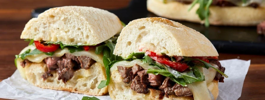 خبز فرنسي - لحمه شحات - بصل - ماشروم - موزاريلا